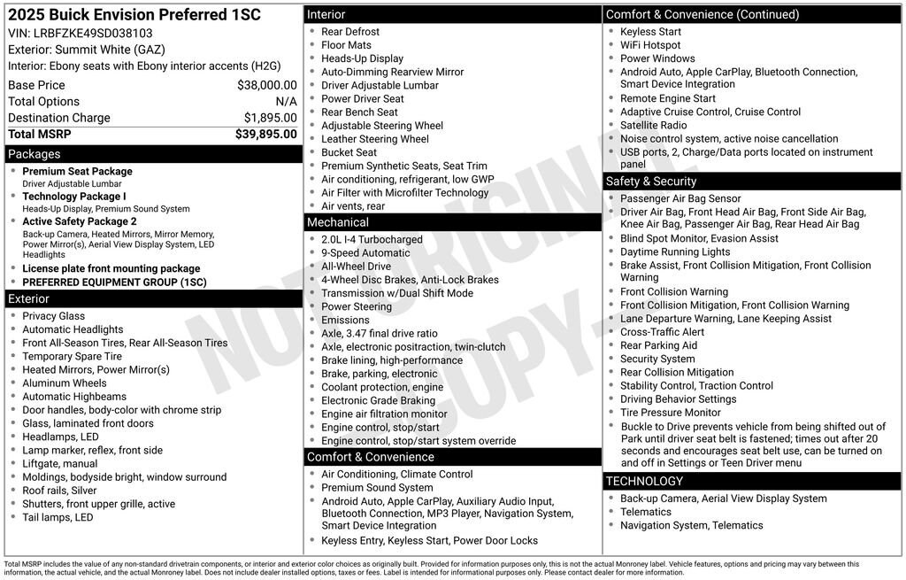 Our One Owner, Accident Free 2025 Buick Envision Preferred AWD invites you to enjoy an elevated ownership experience in Summit White! Powered by a TurboCharged 2.0 Liter 4 Cylinder supplying 228hp to a 9 Speed Automatic transmission for refined performance. You can also benefit from premium ride and handling in this All Wheel Drive SUV, which returns nearly 28mpg on the highway with a sleek and stylish exterior. It's a sophisticated look that helps turn heads with LED lighting, silver roof rails, bright bodyside molding, eye-catching 18-inch alloy wheels, and heated power mirrors with memory.