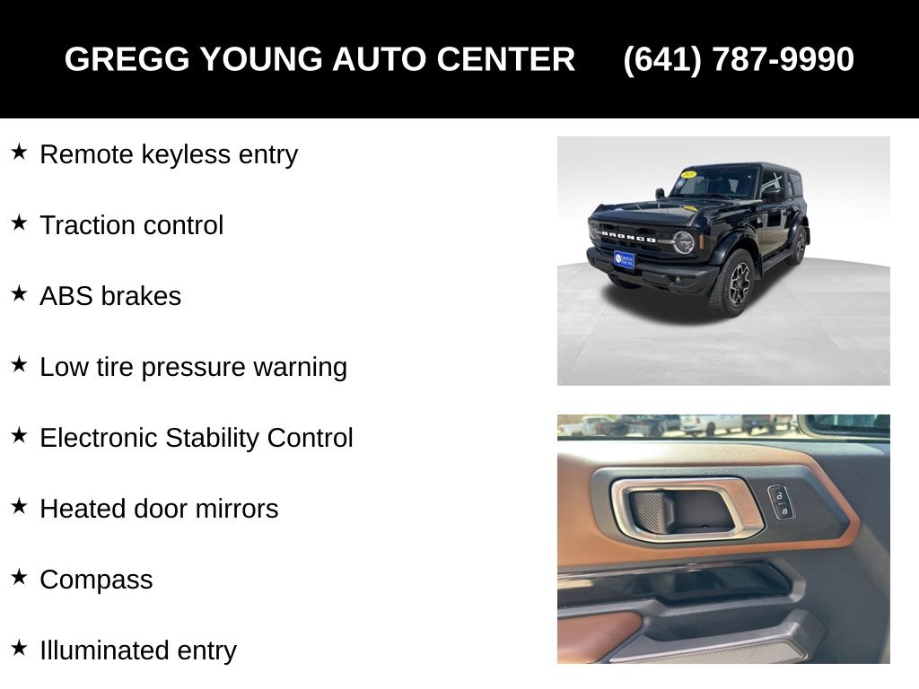 Ford brings an intelligent approach to modern safety with a rearview camera, automatic braking, trailer sway control, tire pressure monitoring, stability/traction control, hill start assistance, and more. You can bet our Bronco is ready to ride with features like those! Save this Page and Call for Availability. We Know You Will Enjoy Your Test Drive Towards Ownership!