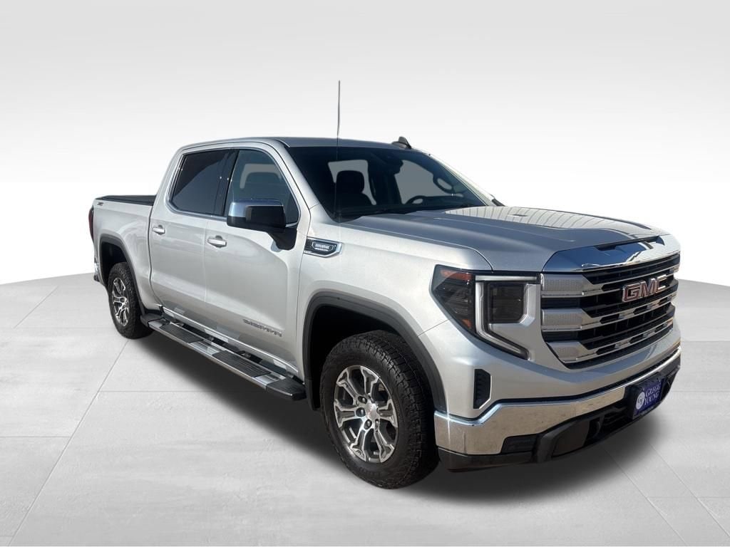 Our Diesel powered One Owner, Accident Free 2022 GMC Sierra 1500 SLE Crew Cab 4X4 with the X31 Off Road Pack is ready to get your next job done right with robust capability in Quicksilver Metallic! Motivated by a TurboCharged 3.0 Liter Duramax Diesel 6 Cylinder generating 277hp and 460lb-ft of torque for a 10 Speed Automatic transmission with a tow/haul mode for easier pulling. This Four Wheel Drive truck also features a responsive suspension for handling real-world action, and it sees nearly 26mpg on the highway. Our Sierra looks tough, too, with a versatile MultiPro tailgate, LED lighting, alloy wheels, cargo-bed tie-downs, running boards, tonneau cover, and chrome bumpers with a rear CornerStep.